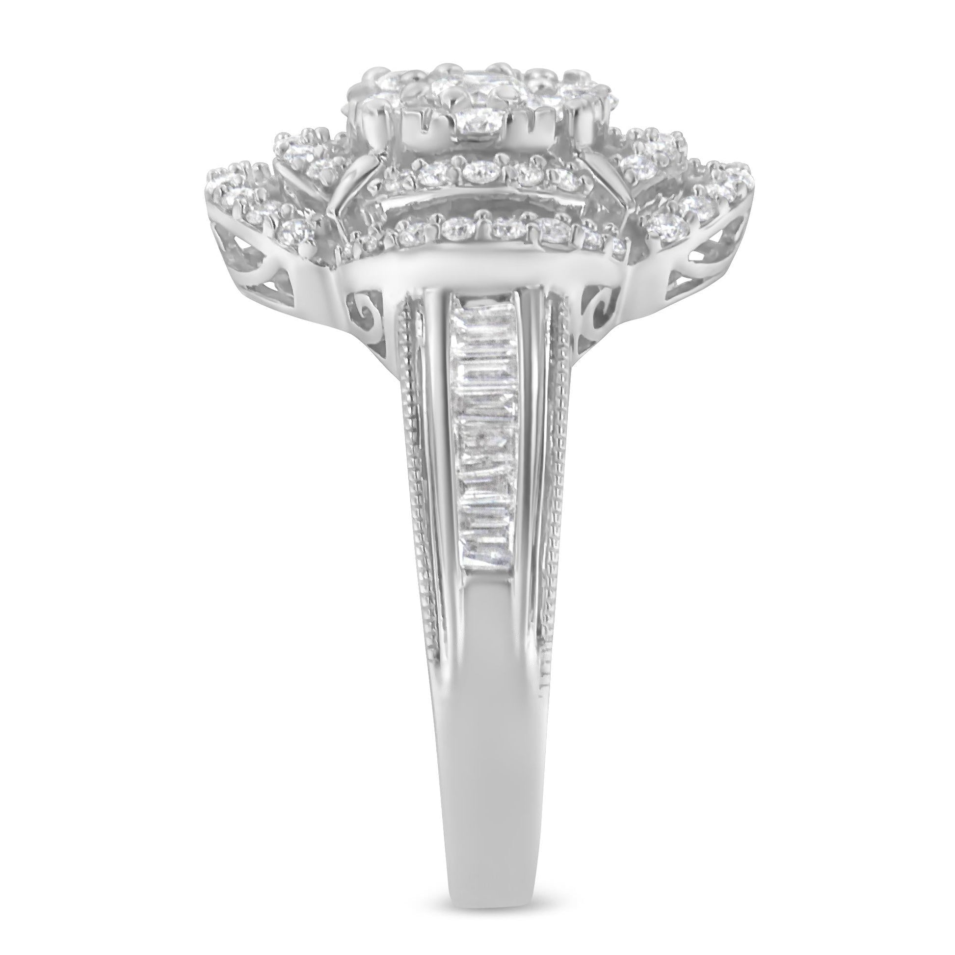 Elegant and timeless, this gorgeous 14K white gold diamond cocktail ring features 1.0 carat total weight of diamonds with a whopping 75 individual stones. The fashion ring features a round cluster with nine round, brilliant cut white diamonds centered inside flared quatrefoil petals studded with petite white gems. The tapered, cathedral style band features a row of channel set baguette cut diamonds with milgrain beading design details on the sides of the band. The ring has a decorative openwork filigree swirl gallery. This classic, feminine flower inspired cocktail ring makes a great gift for any special occasion! Whether worn for daytime glamour or evening sparkle, this cocktail ring is gorgeously versatile. Give her a gift that will perfectly complement her favorite ensemble.