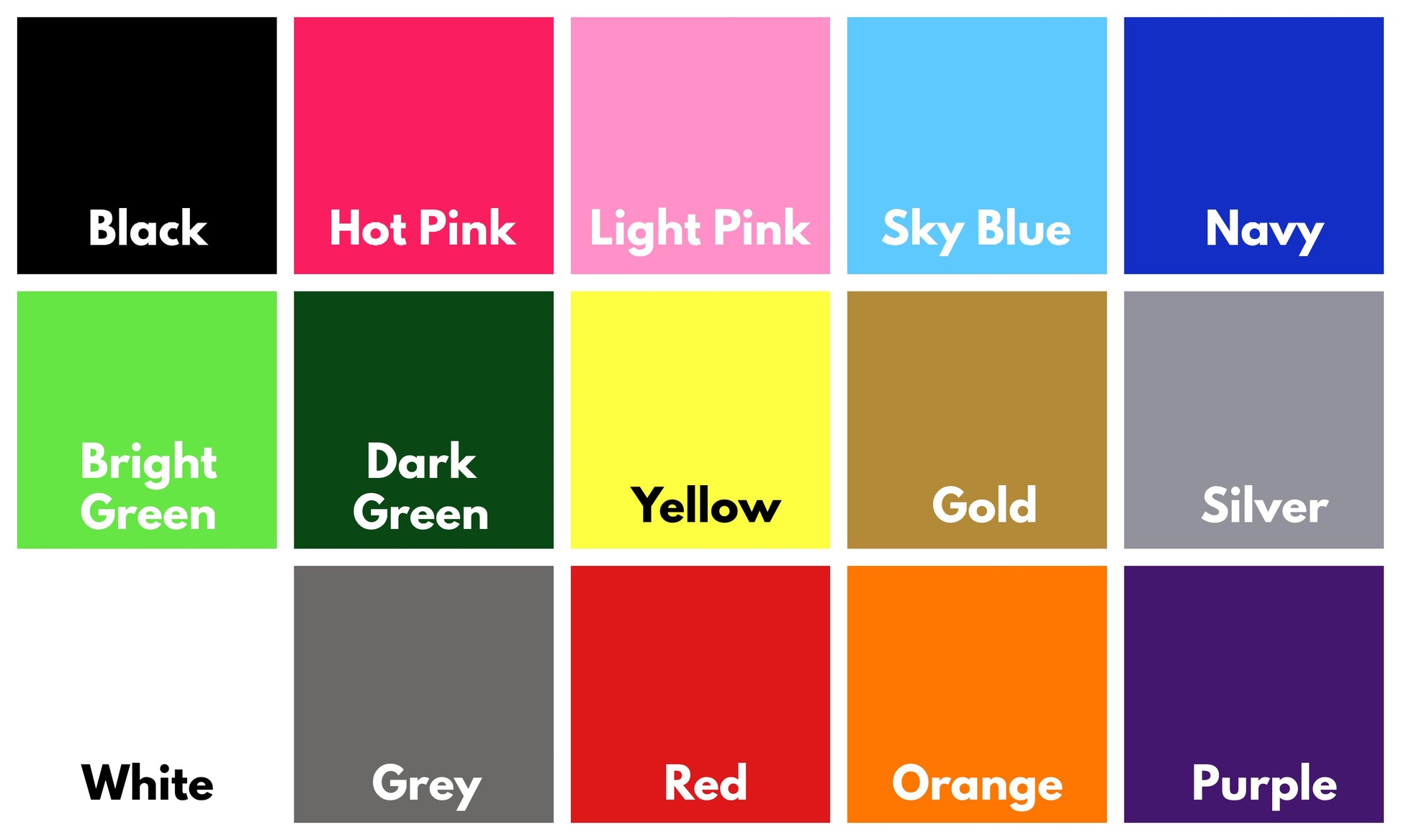 BLACK,HOT PINK, LIGHT PINK,SKY BLUE,NAVY BLUE, BRIGHT GREEN,DARK GREEN,YELLOW,GOLD,SILVER,WHITE,GREY.
