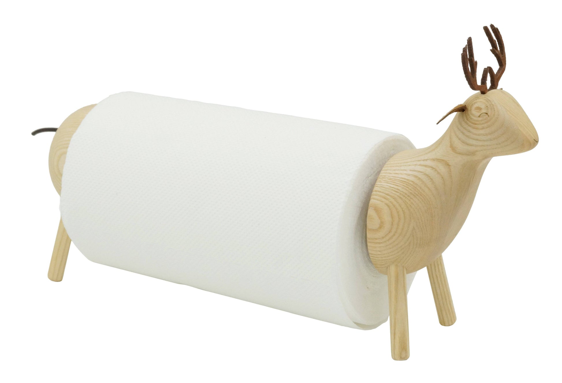 The body of the reindeer serves as the base for the paper towel roll, with the roll fitting snugly between the reindeer's antlers and back, allowing for easy dispensing. The natural wood grain of the ash enhances the aesthetic appeal, providing a warm, organic touch to the design. The holder is sturdy, with the reindeer's four legs providing a stable base, ensuring it stays in place while you tear off a sheet.