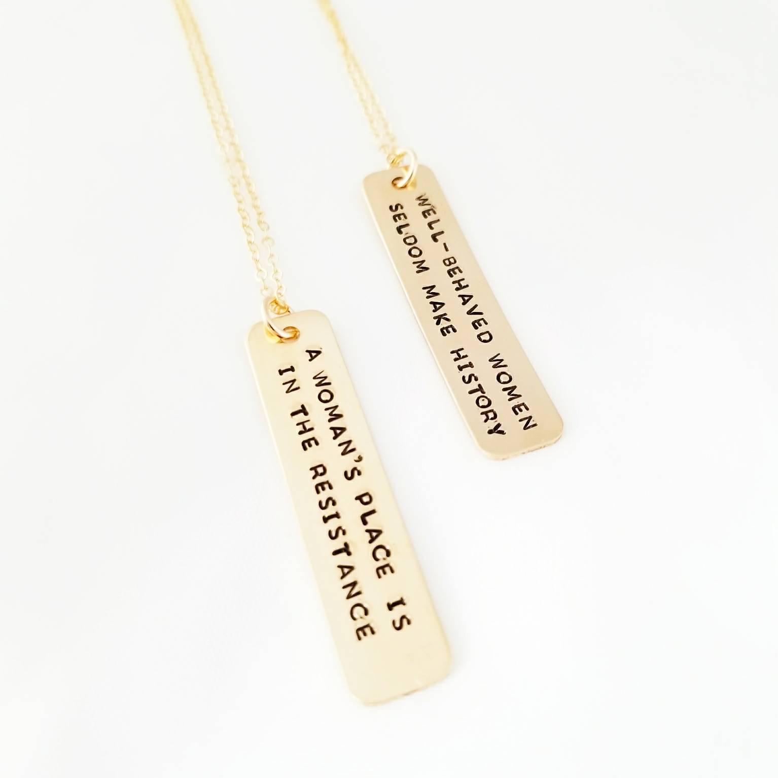 Style and substance come together in this beautiful vertical bar necklace hand-stamped with the feminist phrase of your choice in tiny uppercase letters. Choose from the following inspirational phrases: