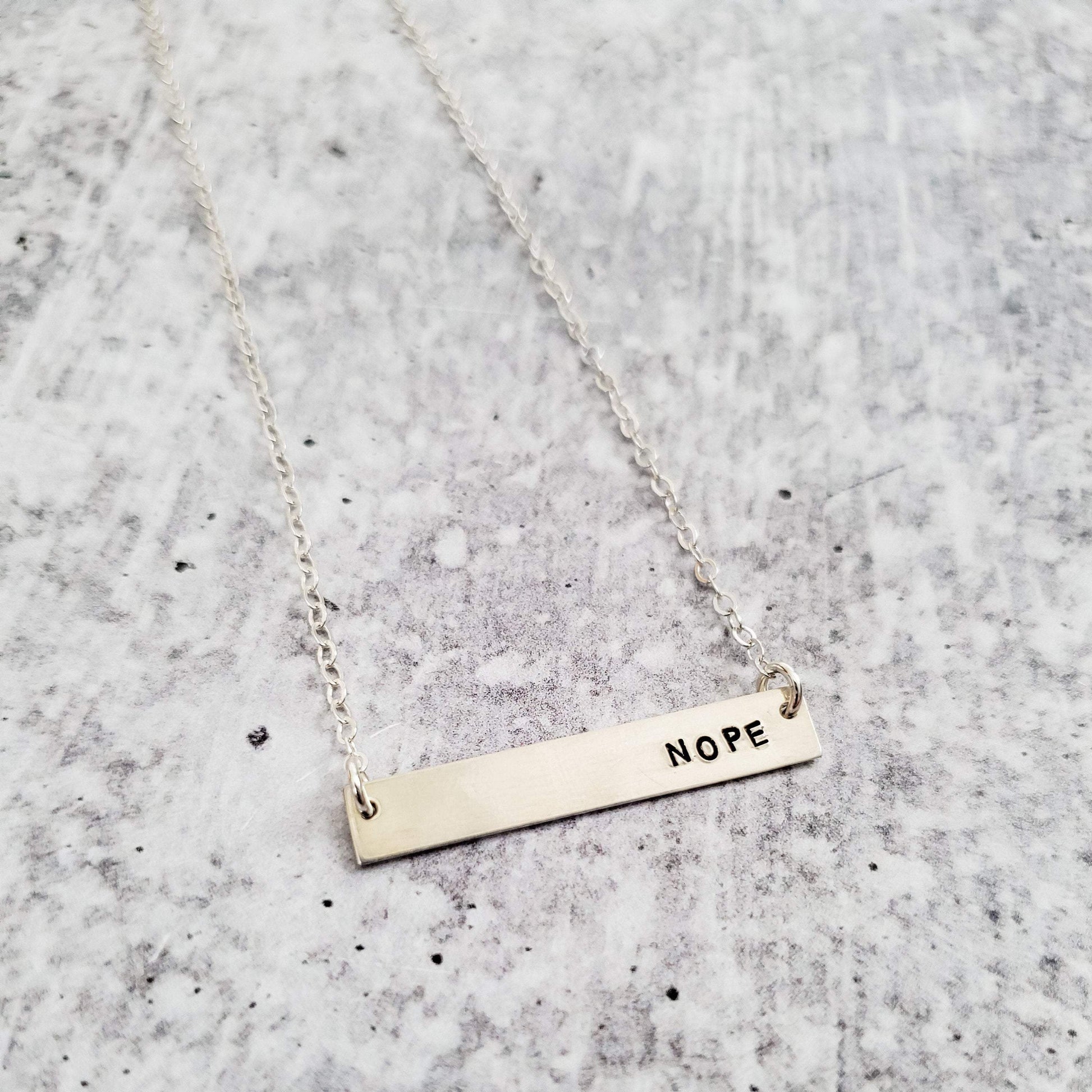 This is a beautiful and shiny bar necklace hand stamped with NOPE in tiny uppercase block letters. This is a great accessory for your girl gang bestie or anyone else fed up with all of the sickeningly sweet messages out there and want to keep it real!