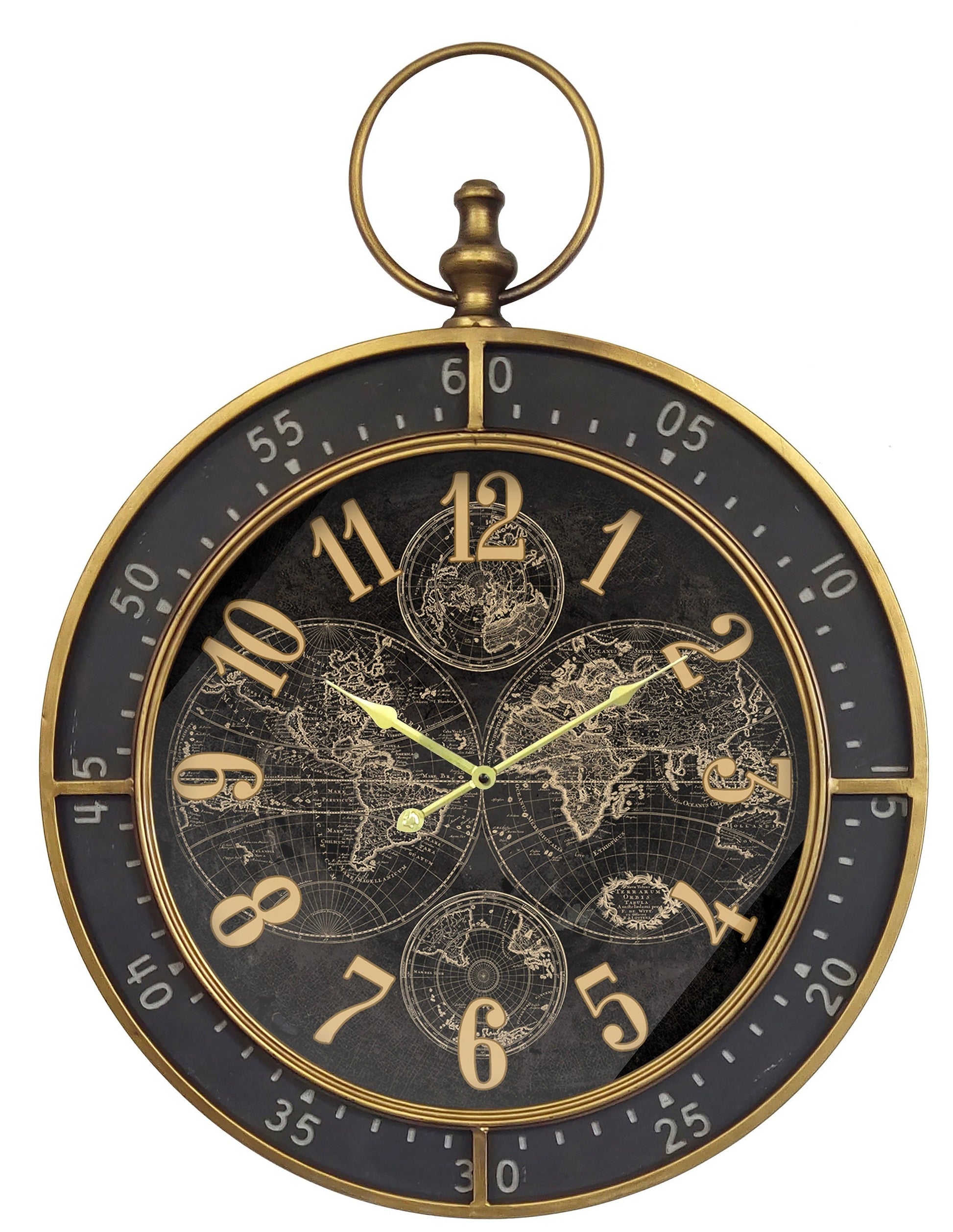 This pocket watch style wall clock is made of metal and features glass face, brush golden metal frame, large, easy to read Arabic numerals for hours and minutes, with background of global navigation chart.Quartz clock movements ensure reliability and trouble-free service. Requires 1 AA battery (not included).