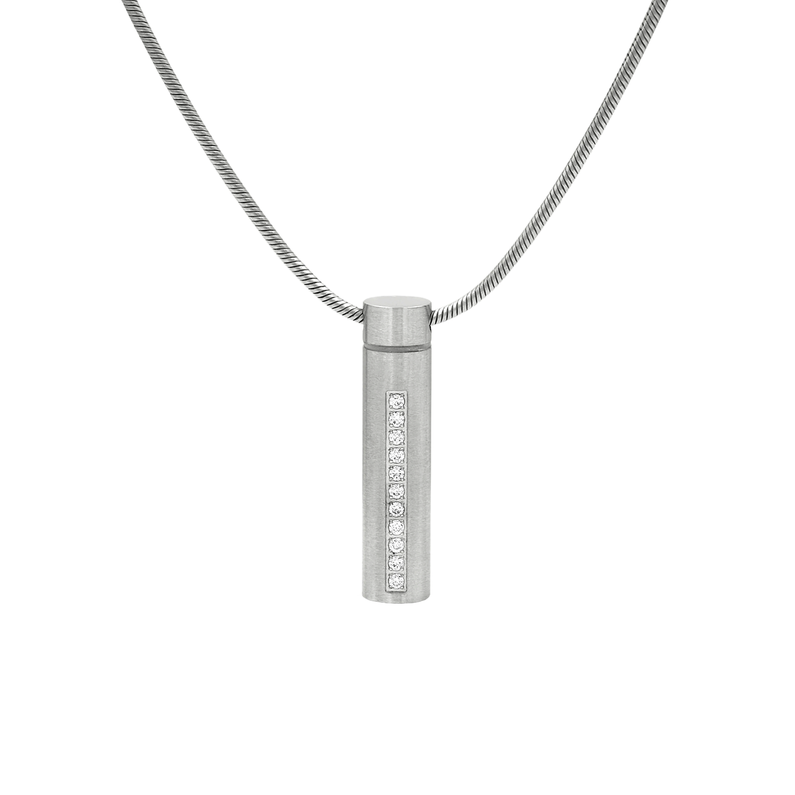 The body of this pendant is a surgical stainless steel cylinder with absorbing felt inside, polished and highly durable. The twist-off closures insure you never have to worry about getting oil on your clothes. We only use hypoallergenic surgical stainless steel with our jewelry, ensuring that your skin will never suffer when you wear our pieces. Hidden within the cylinder is a row of our finest .02 ct B.Tiff Diamond Alternative stones. Rivaling mind diamonds in fineness, flash, and fire, our stones are cut to optimally reflect light at all angles.