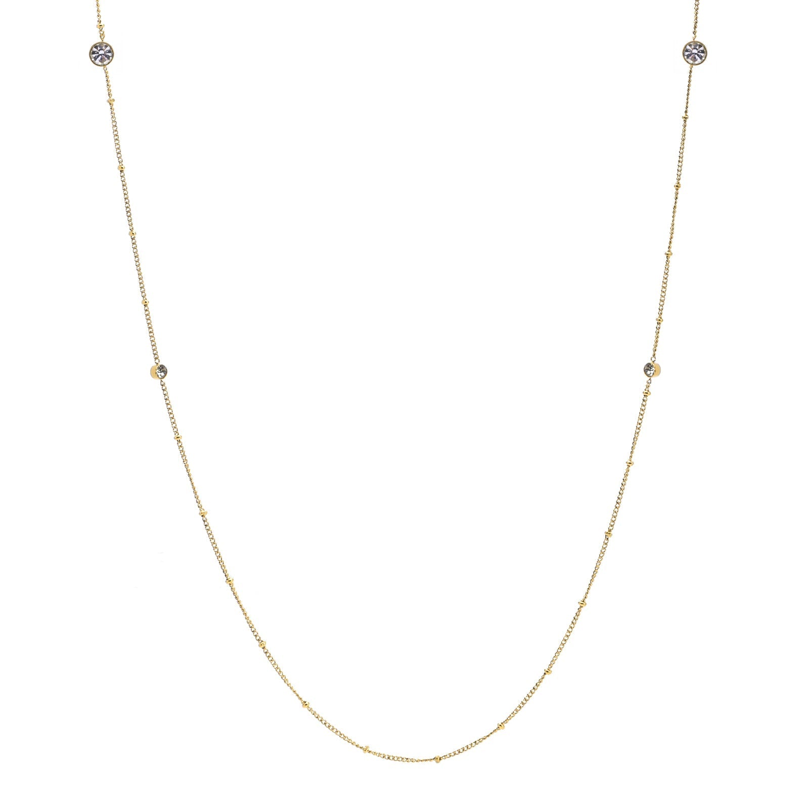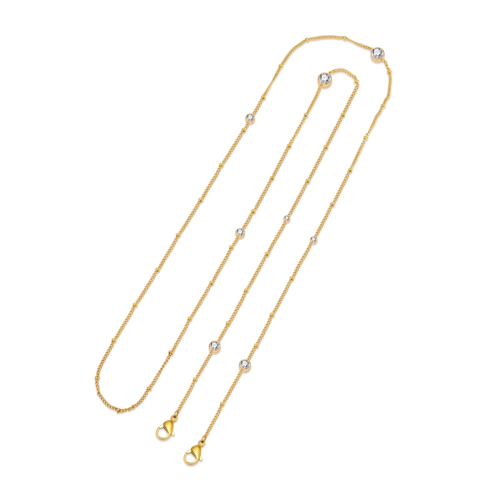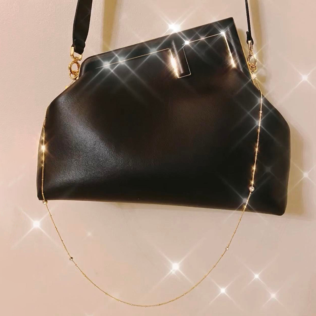 This dainty chain necklace has 8 B.Tiff alternative diamonds pavéd in many gold beads through out the chain giving the whole necklace brilliant shine especially with movements. The double hooks used for the necklace closure enables the two ends to hook onto different objects such as your gorgoues bags making this neckalace extremely versatile. It can also be worn as a bracelet by wrapping it around the wrist. The chain can be a stand-alone necklace or can be stacked with other necklaces for a very sylish look. A stunning piece with mutiple wear options and possibilities, tt adds that needed "bling" to complete a fashionista's look.
