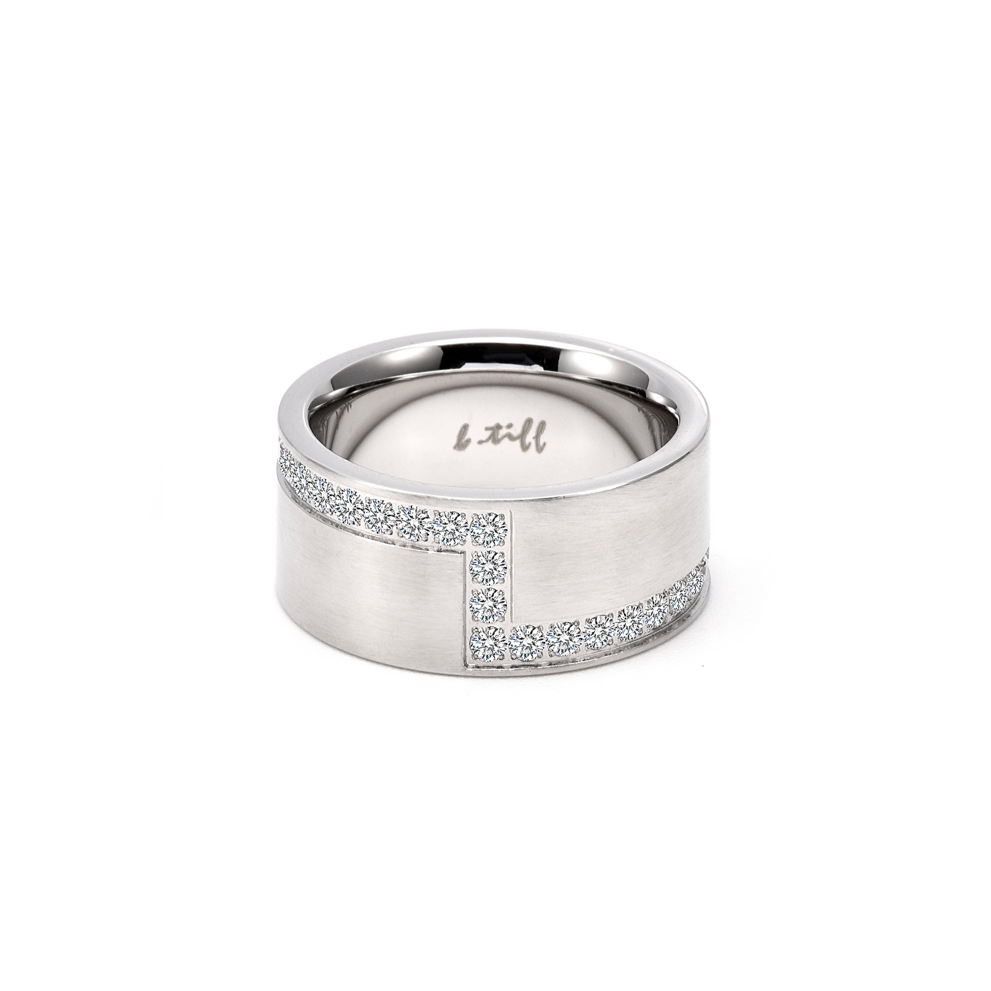 The wide, 10mm ring comes framed with a unique cross pattern of .02 ct round B.Tiff Diamond Alternative stones that shine brighter than the highest grade diamonds. This ring catches the light at every angle, giving you that perfect sparkle no matter how you wear it. Featuring hypoallergenic, surgical stainless steel, it won’t irritate even the most sensitive skin.