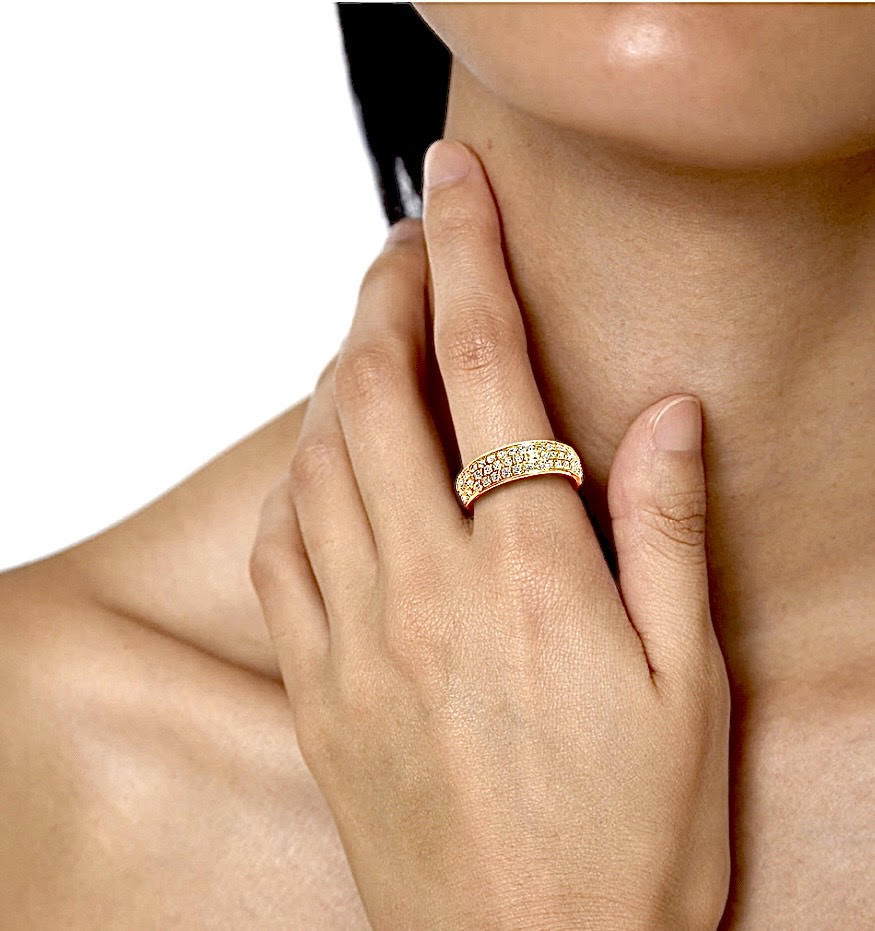 Covered head to toe in three rows of brilliant .01 ct B.Tiff Diamond Alternative stones, over 100 stones are here to dazzle you and whoever your lucky date is tonight. If you’re looking for some extra adoration, then this ring will do it. The stones are set in our hypoallergenic, surgical stainless steel. Choose between dazzling silver or always attractive gold.