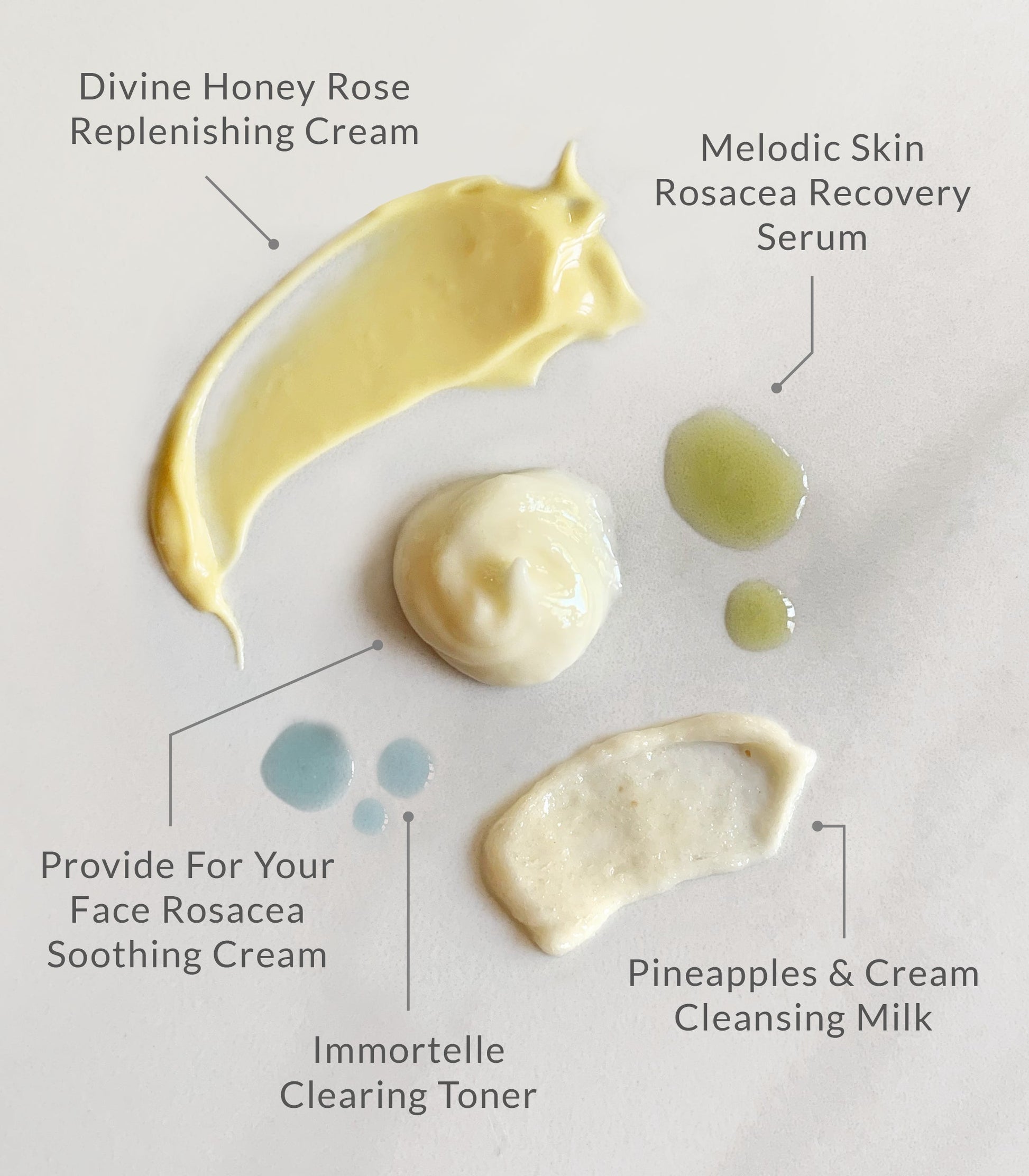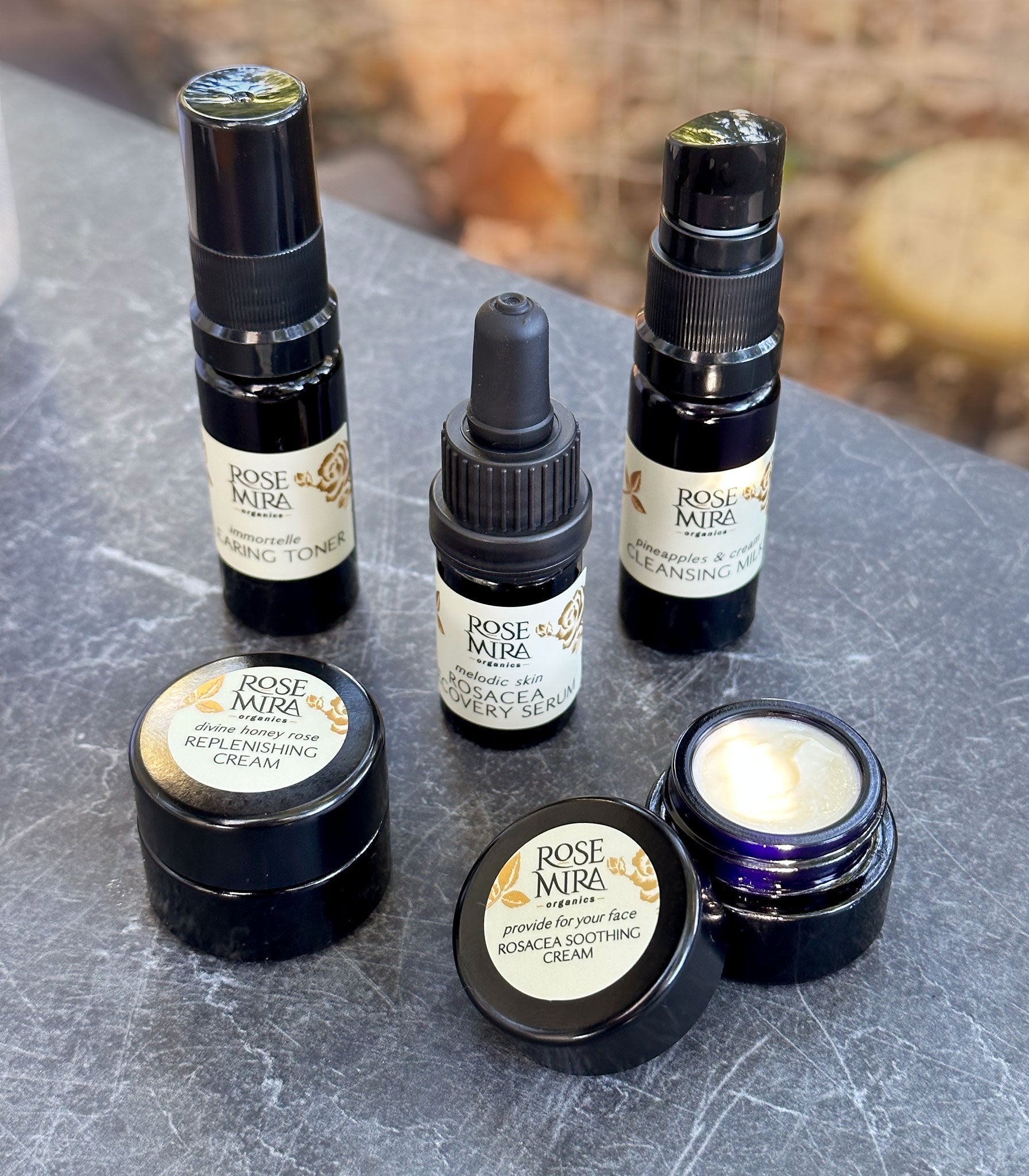Five of our best products for treating Rosacea, redness, and persistent inflammation, are packaged in Swiss Violet Glass. A complete kit for morning and night routines.