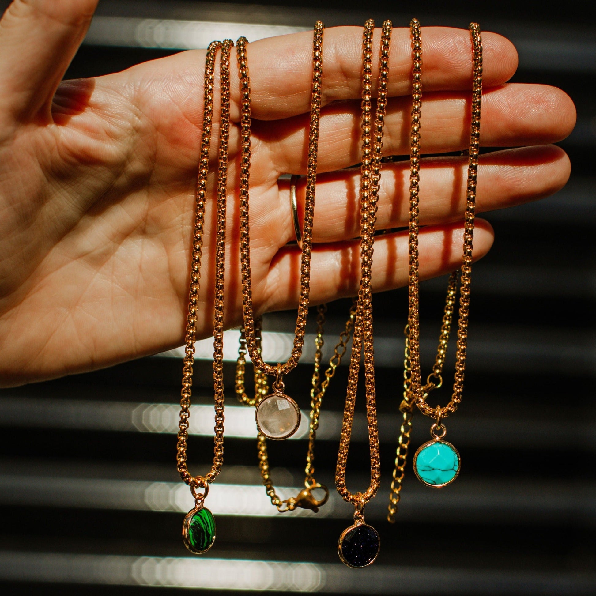 Say hello to these stunning and classic 14k Gold Plated necklaces, featuring semi-precious stones. Not only are these pieces water-resistant, they also add a fun and elegant touch to your look on a 18.5-20.5" rolo chain with a 2" extender.
