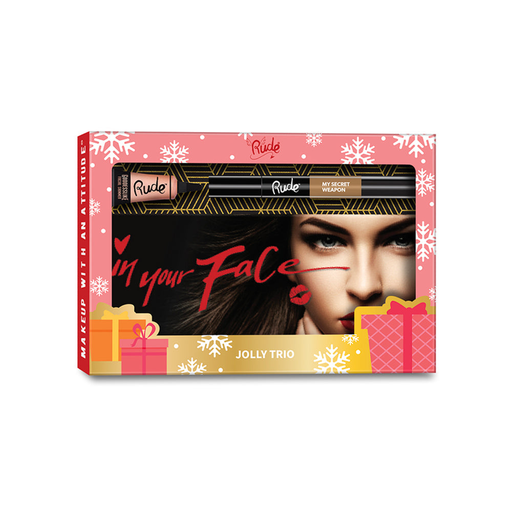 RUDE IN YOUR FACE 3-IN-1 PALETTE In Your Face 3-In-1 Kit featuring 16 gorgeous shades ranging from brows to contours and eyes. All you need for a perfect look under a single palette. Cruelty-Free Paraben-free Net Wt. : Eyebrow: 0.106 oz. / 3 g Contour: 0.423 oz. / 12 g Eyeshadow: 0.317 oz. / 9 g RUDE MY SECRET WEAPON PREP+PRIME HIGLIGHTER A small but deadly accurate secret weapon to add to your arsenal. Rude's My Secret Weapon Prep / Prime Highlighter is great for accentuating your most beautiful features with a natural matte look. Cruelty-Free Paraben-free Net Wt. : 0.10 fl. oz / 3 ML RUDE GODDESSLIKE FACIAL SHIMMER Our Goddesslike Facial Shimmer is radiance in a bottle. Designed to instantly brighten and soothe skin with no greasy after-feel. Ideal for using on your cheeks, lips, eyelids or anywhere you would like a radiant pop of shimmering color. Cruelty-Free Paraben-free Net Wt. : 0.338 oz / 10 ML Ingredients RUDE IN YOUR FACE 3-IN-1 PALETTE EYEBROW INGREDIENTS: Mica, Talc, Tridecyl Trimellitate, Zea Mays (Corn) Starch, Ethylhexyl Palmitate, Magnesium Stearate, Hydrogenated Styrene / Isoprene Copolymer, Polybutene, Phenoxyethanol, Mineral Oil, Caprylyl Glycol, Silica, Methyl Methacrylate Crosspolymer. May Contain: Titanium Dioxide, Iron Oxide Yellow, Iron Oxide Red, Iron Oxide Black. CONTOUR INGREDIENTS: Mica, Talc, Tridecyl Trimellitate, Zea Mays (Corn) Starch, Ethylhexyl Palmitate, Magnesium Stearate, Hydrogenated Styrene / Isoprene Copolymer, Polybutene, Phenoxyethanol, Mineral Oil, Caprylyl Glycol, Silica, Methyl Methacrylate Crosspolymer. May Contain: Titanium Dioxide, Iron Oxide Yellow, Iron Oxide Red, Iron Oxide Black, Tin Oxide, FD&C Yellow 6 Lake, FD&C Yellow 5, D & C Red 7 Ca. EYESHADOW INGREDIENTS: Mica, Talc, Tridecyl Trimellitate, Zea Mays (Corn) Starch, Ethylhexyl Palmitate, Magnesium Stearate, Polybutene, Phenoxyethanol, Mineral Oil, Caprylyl Glycol, Hydrogenated Styrene/Isoprene Copolymer, Silica, Methyl Methacrylate Crosspolymer. May Container: Titanium Dioxide, Iron Oxide Yellow, Iron Oxide Red, Iron Oxide Black, Tin Oxide, Blue 1 Lake, Ferric Ferrocyanide, Manganese Violet, Ultramarines, Yellow 5 Lake. RUDE MY SECRET WEAPON PREP+PRIME HIGLIGHTER INGREDIENTS: Water, Propylene Glycol, Cyclopentasiloxane, Mineral Oil, Ethylhexyl Palmitate, Ceresin, Cetyl PEG/PPG-10/1 Dimethicone, Disteardimonium Hectorite, Sorbitan Sesquioleate, Caprylyl Glycol/Phenoxyethanol. MAY CONTAIN: Iron Oxide Black, Iron Oxide Red, Iron Oxide Yellow, Titanium Dioxide. RUDE GODDESSLIKE FACIAL SHIMMER INGREDIENTS: WATER, MINERAL OIL, ETHYLHEXYL PALMITATE, CERESIN, BIS-DIGLYCERYL POLYACYLADIPATE-2, PROPYLENE GLYCOL, SORBITAN SEQUIOLEATE, MICA, CAPRYLYL GLYCOL/PHENOXYETHANOL. MAY CONTAIN: IRON OXIDE BLACK, IRON OXIDE RED, IRON OXIDE YELLOW, TITANIUM DIOXIDE, D&C RED 6 BA LAKE, D&C RED 7 AL LAKE.