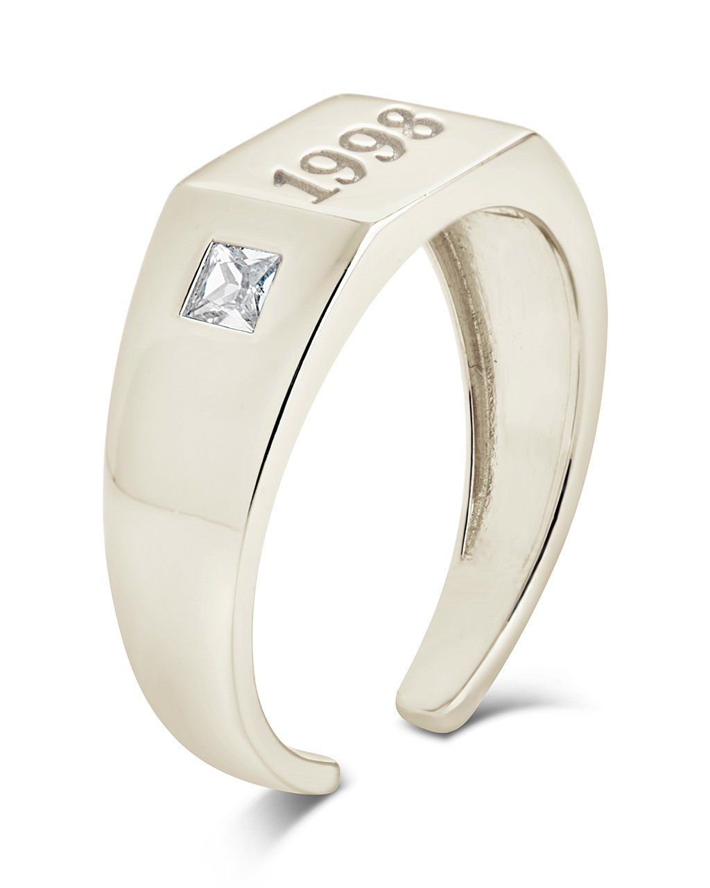 It's time to celebrate! Add a little flair to your look with this sleek open birth year signet ring. Each one features an engraved year and two CZ stones. Available in gold and silver tones.
