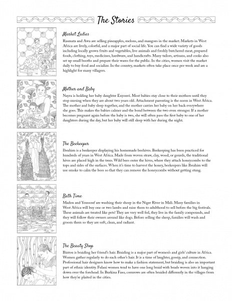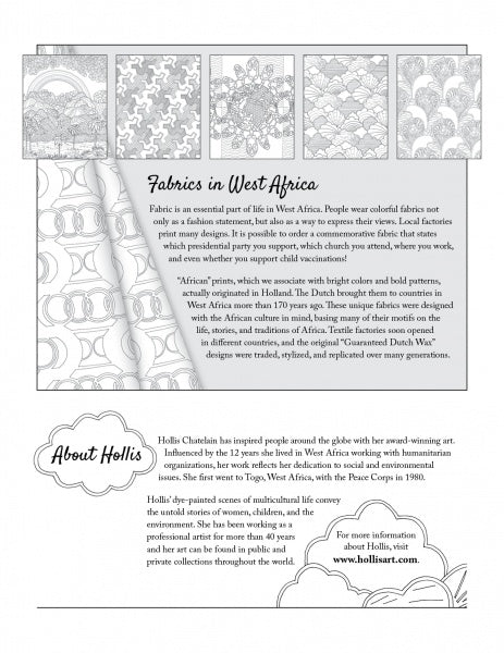 Fabric is an essential part of life in West Africa; people wear colorful fabrics not only as a fashion statement, but also as a way to express their views. These 20 exquisite drawings show scenes from daily life—spending time with family, kids pounding millet as part of their daily chores, and even the process of checking bee hives! Each scene includes a textile backdrop featuring the cloth of West Africa. These fabrics are part of Hollis Chatelain’s personal collection from her 12 years in Africa.[AuthorName]By (author) Hollis Chatelain[/AuthorName][AuthorBio]Fabric artist Hollis Chatelain’s dye-painted scenes of multicultural life convey the stories of women, children, and the environment. Her art can be found in public and private collections throughout the world.[/AuthorBio][NumIllustration]20 drawings[/NumIllustration][CoAuthor][/CoAuthor][SubTitle]A Coloring-Book Journey[/SubTitle][ColorPattern]20 drawings[/ColorPattern]Share