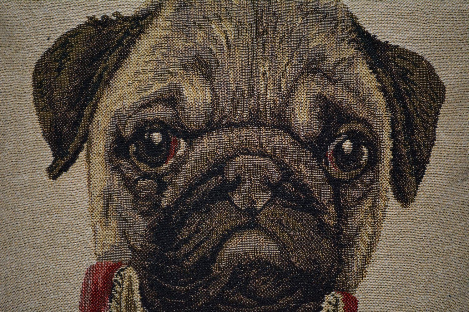 This absolutely adorable pug deserves every honor and then some! So cute and funny this will make a great addition to any dog lover's Home. The front of the pillowcase is a strong, firm upholstery fabric that will take the wear and tear of a room where people live. The back of the pillow is a soft tan fabric. The whole case is edged in a gold cord which gives it a feeling of elegance