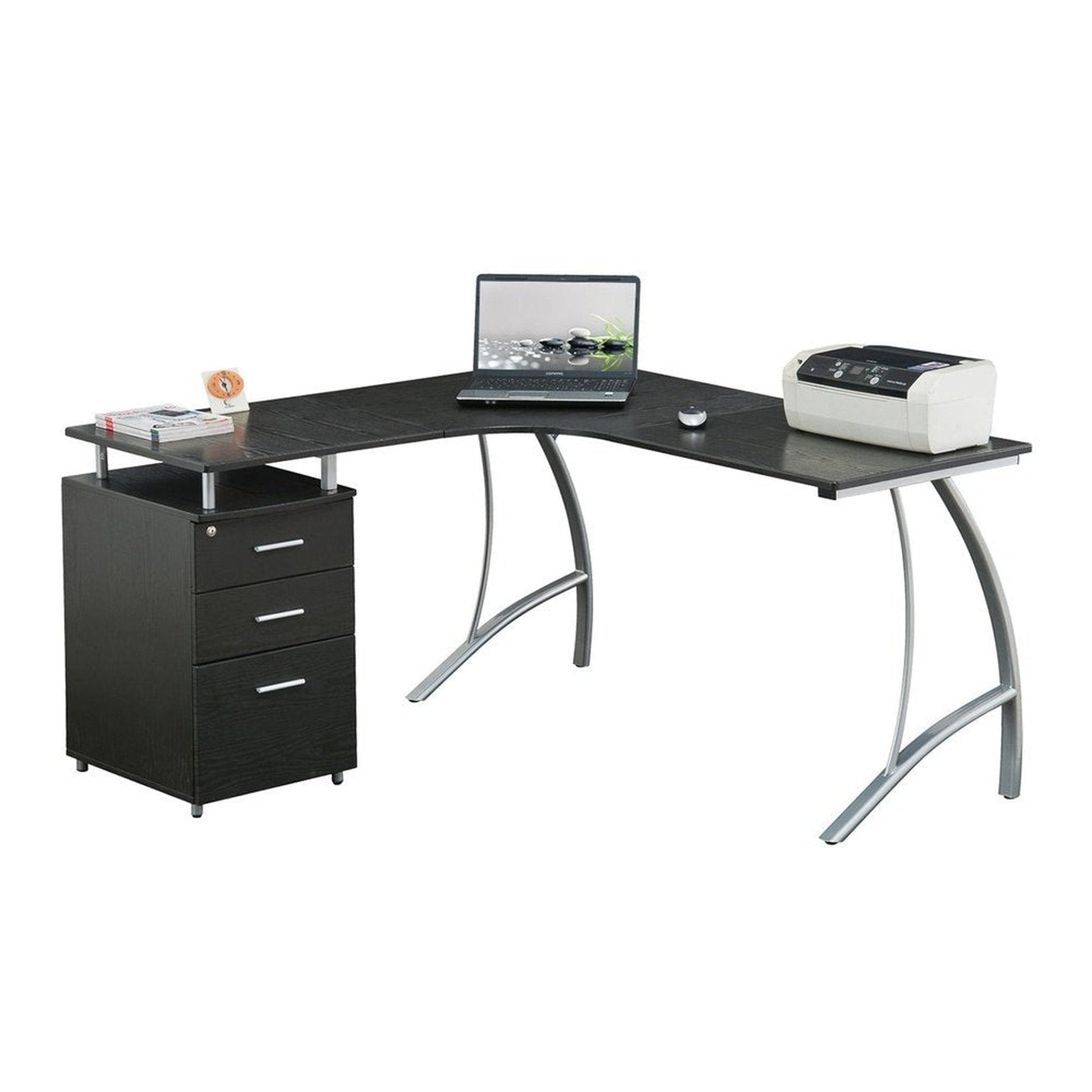 This modern Techni Mobili L-Shaped Computer Desk features a spacious desktop in a curved boomerang shape with a built-in locking storage cabinet and a hanging file cabinet. Curved legs are made of scratch-resistant powder-coated steel, while desktop and storage cabinet are made of heavy-duty engineered wood panels with PVC laminate surface. Color: Espresso