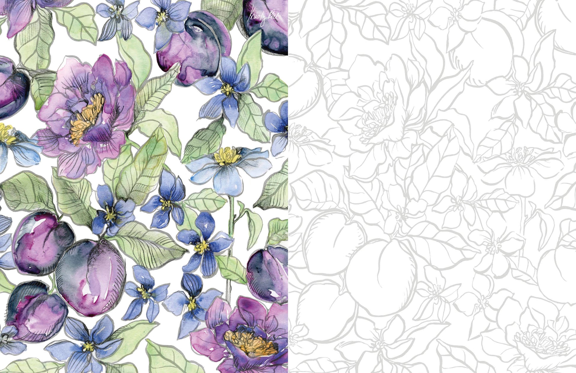 - Includes 9 illustrations ready to be watercolored on thick, textured paper, alongside full-color frameable reproductions of the same works painted by Kristy herself, demonstrating palette choices and brushwork.