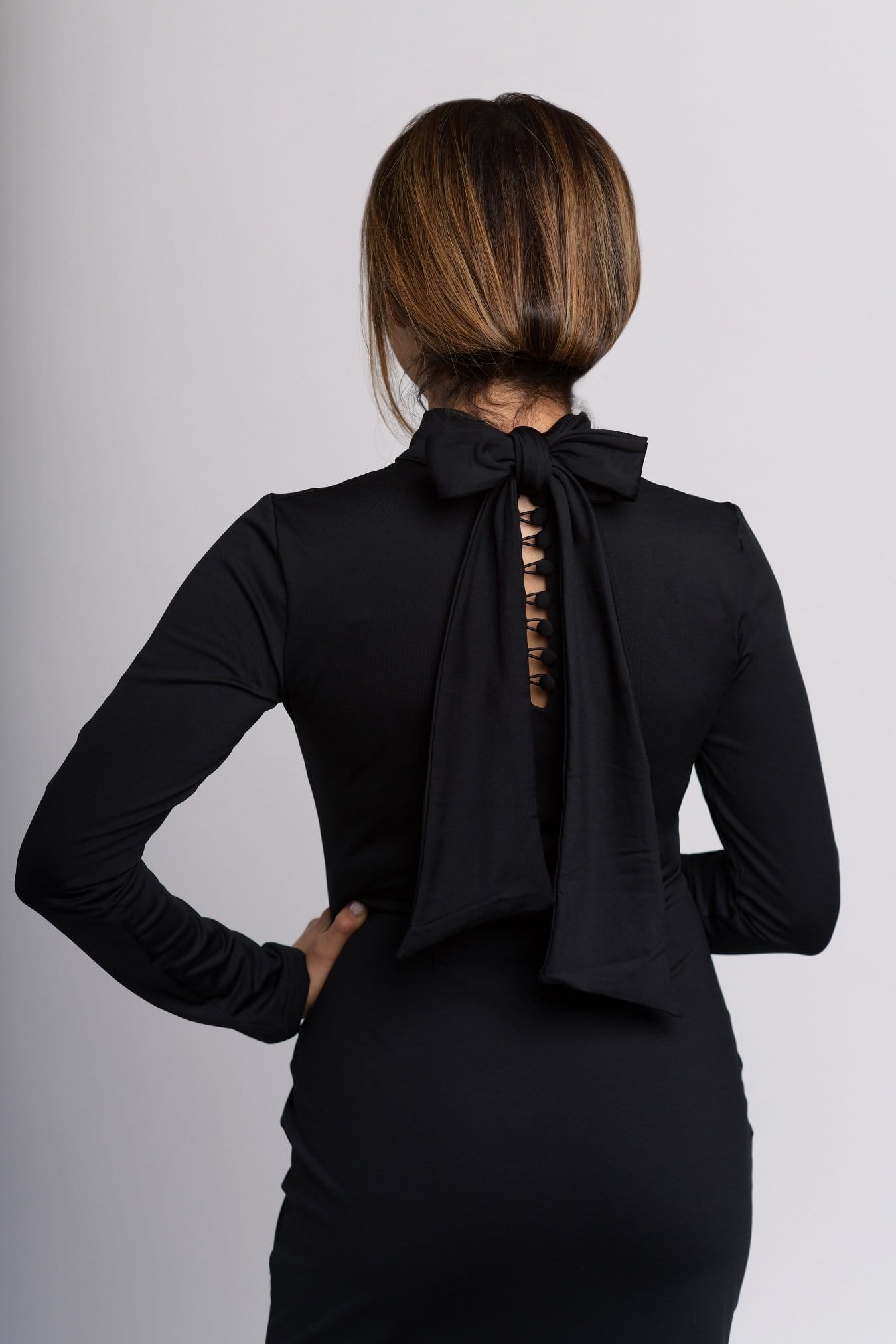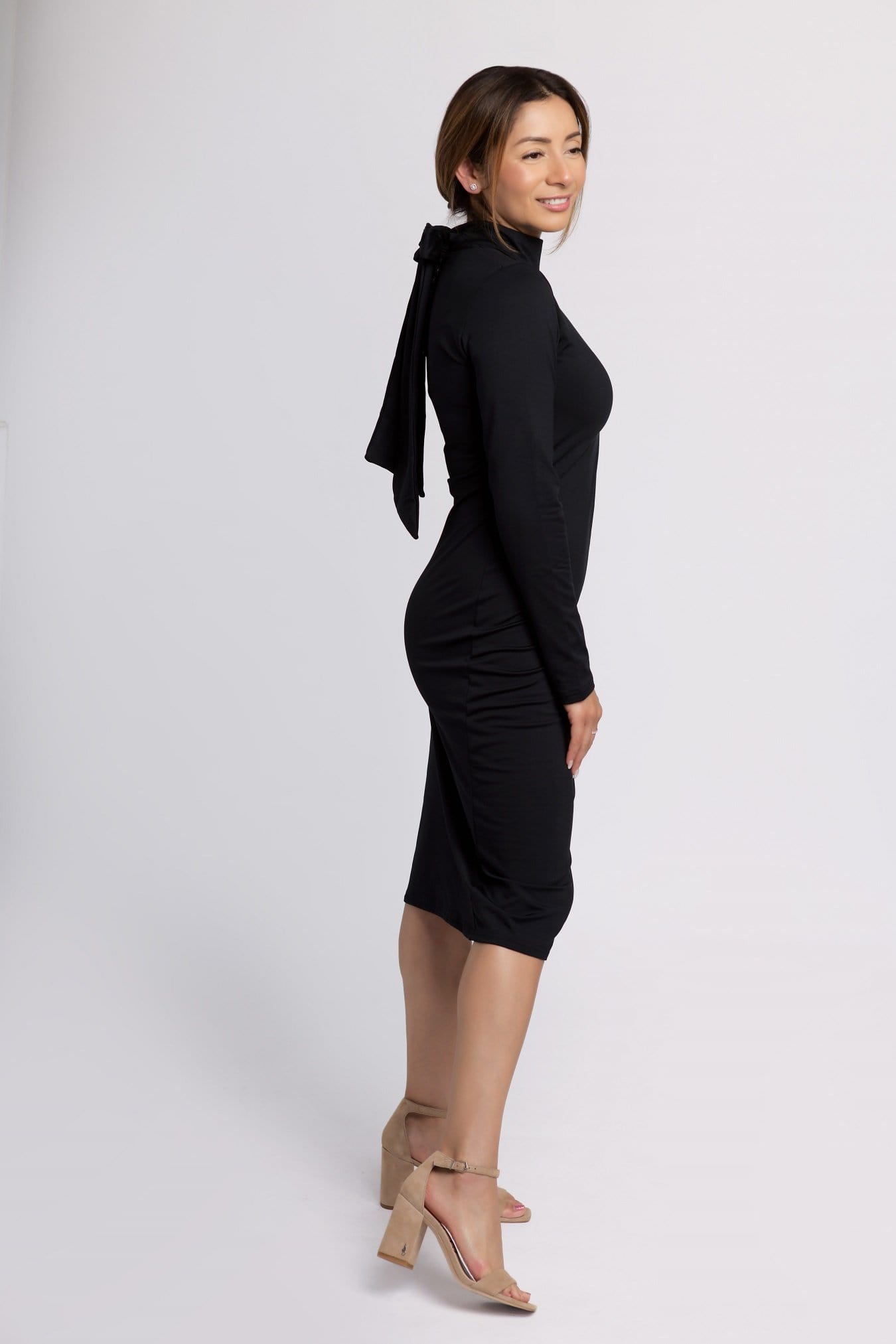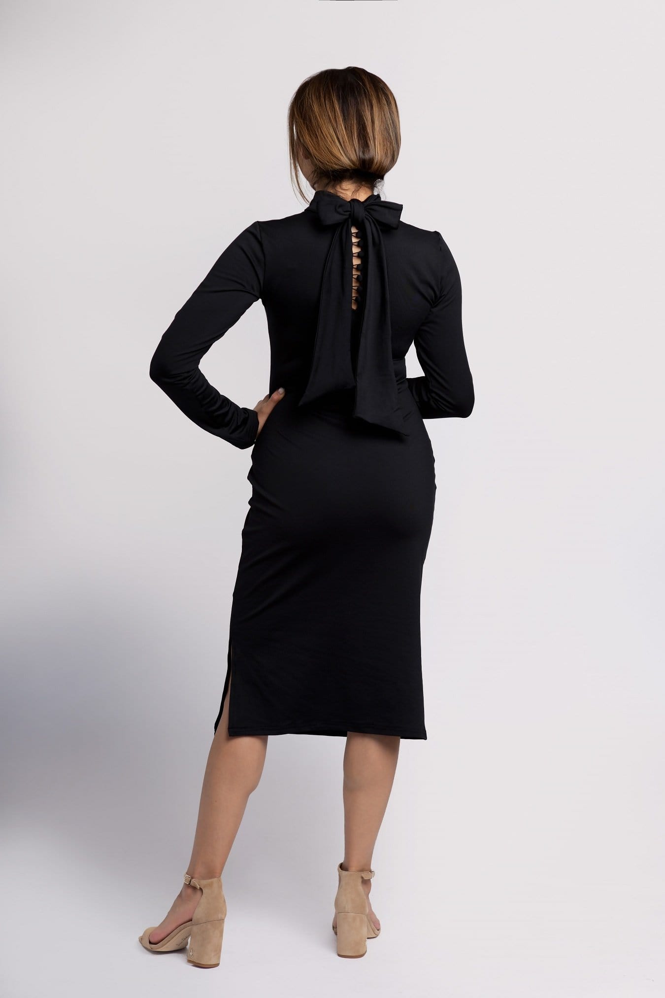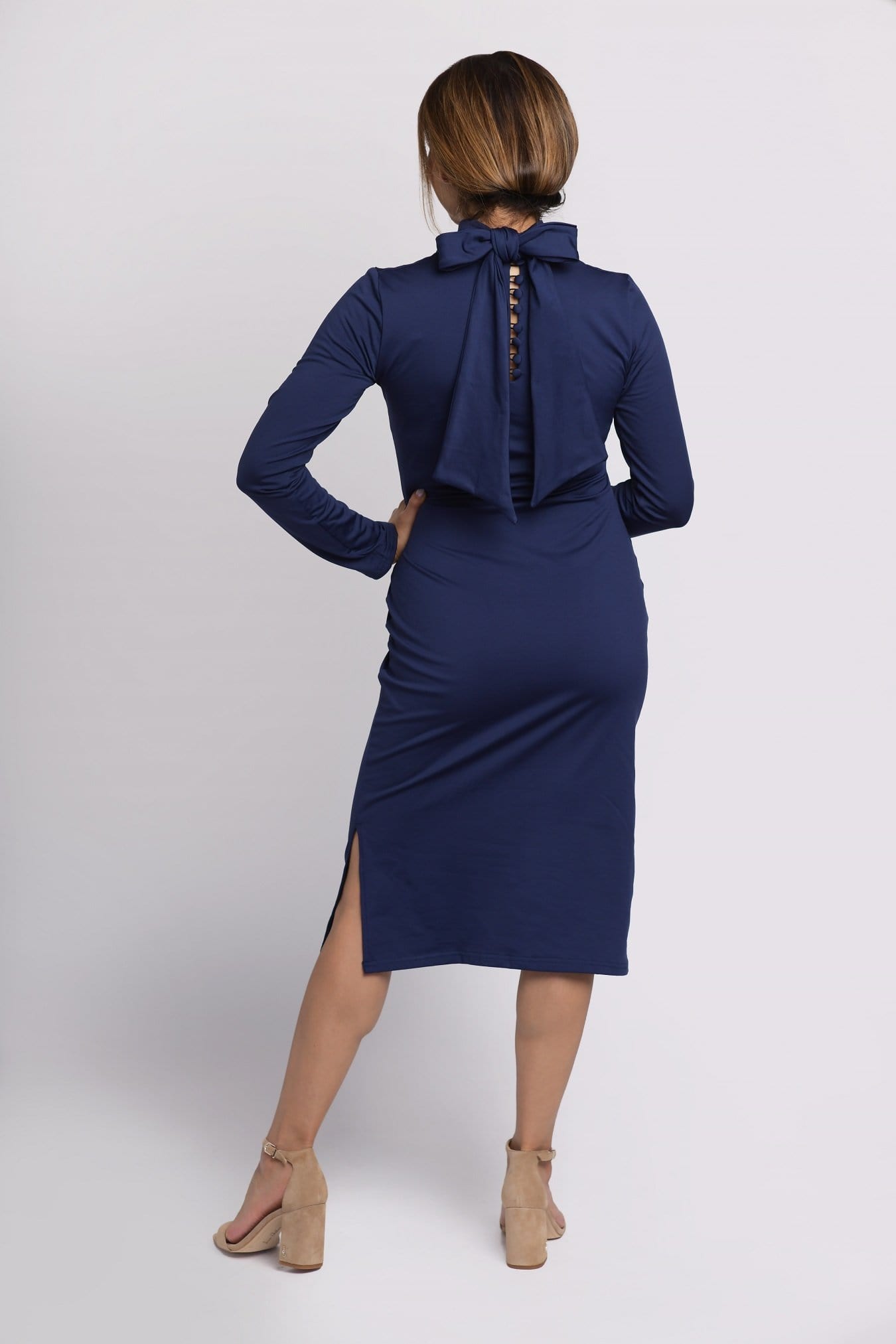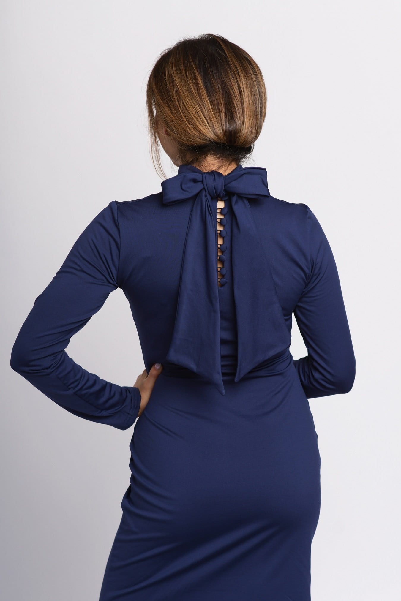 Tied Up is a sophisticated midi dress with a button-up back and feminine bow embellishment at the neck. Available in Marine or Black, it is made from recycled polyester and has a deliciously soft underside against your skin. Love your look and our planet! With every Tulip dress, you have taken post-consumer plastics out of landfills, incinerators, and oceans.