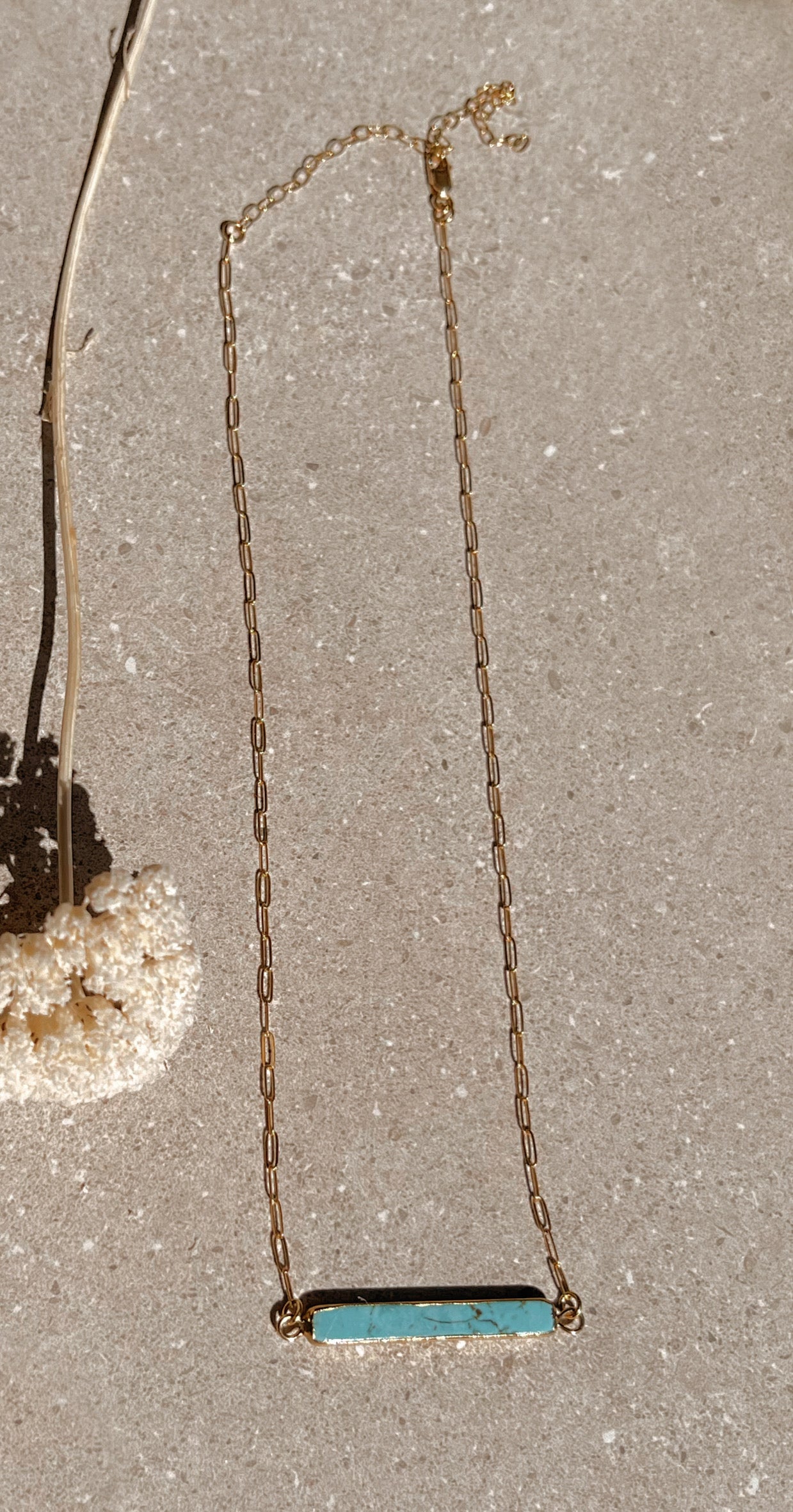 Turquoise bar is made with gold plated edges, giving this necklace a natural glow (pendant is sourced).