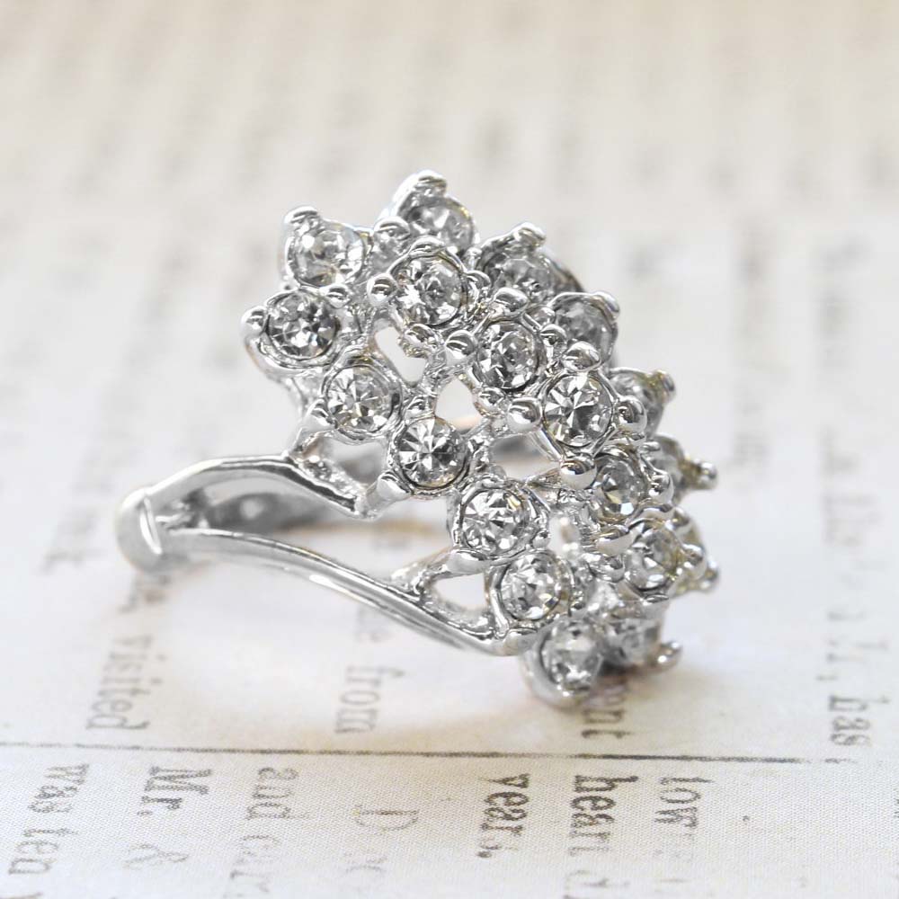 This beautiful Vintage 1980s era clear crystal Cocktail cluster ring is electroplated in 18kt yellow gold. A very pretty ring comfortable to wear all day or for an evening out. Ring is stamped with 18kt HGE. Made in the USA. April Birthstone.