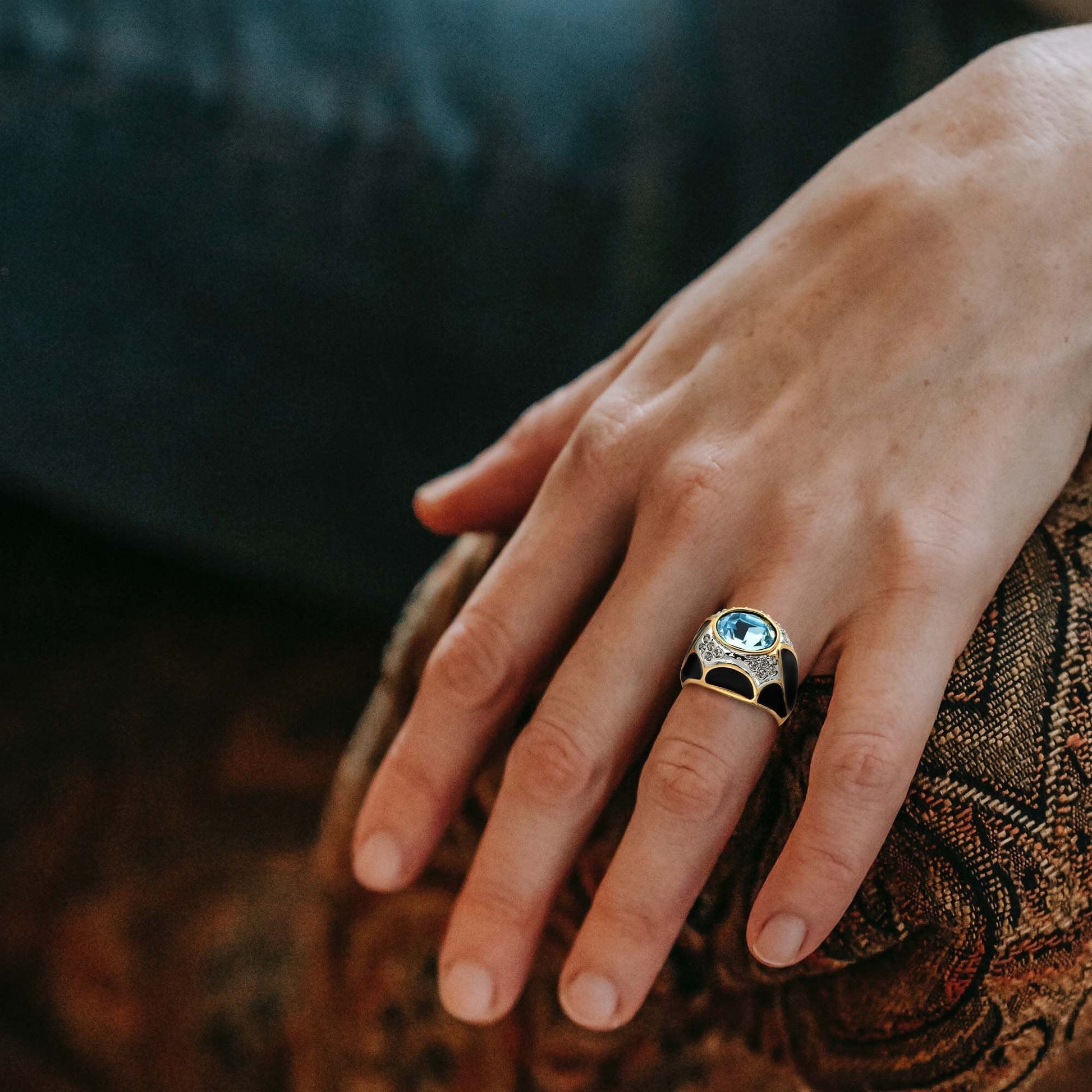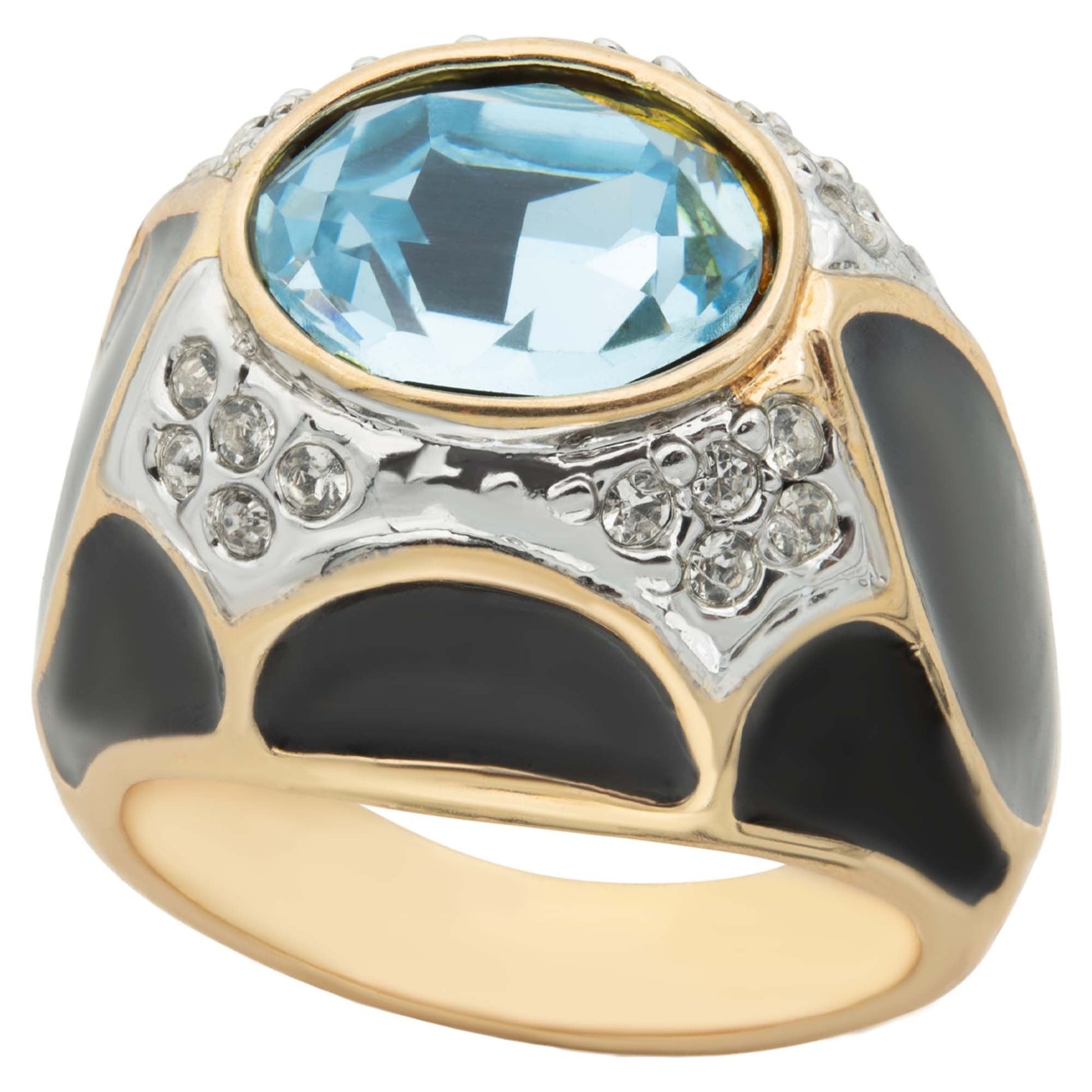 Vintage Ring 1980s Black Enamel Ring with Ruby Cabochon Stone Surrounded by Clear Crystals (6) by PVD Vintage Jewelry