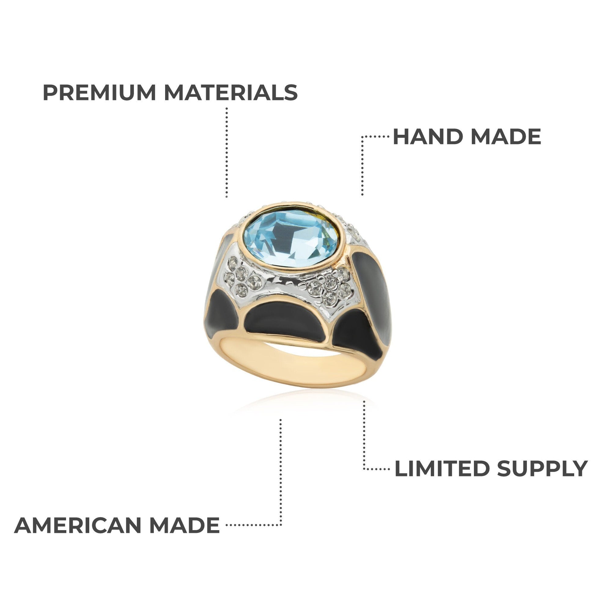 Condition: Excellent (Never worn or owned) 1980s Vintage Ring Made in Providence, RI, USA 18k Gold Plated Black Enamel Ruby Cabochon Crystal Clear Crystals Stamped - 18k HGE Gorgeous handcrafted ring. Take advantage of this unique opportunity as we no longer make this beautiful jewelry! Once our items sell out, unfortunately, they're gone for good.