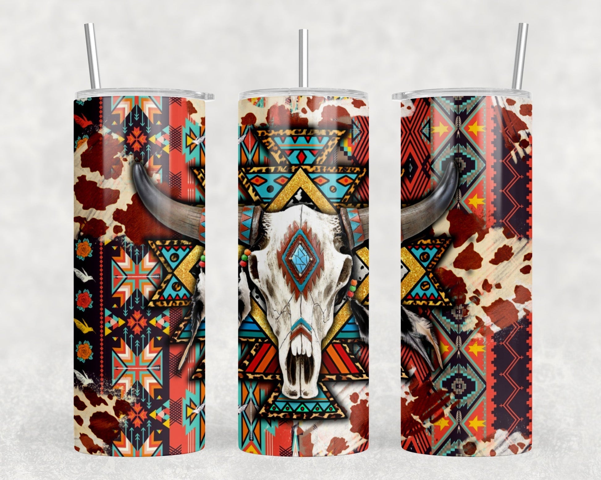 Western Aztec Bull Skull|Skinny Tumbler|Optional Bluetooth Speaker| Speaker Color Varies by Rowdy Ridge Co